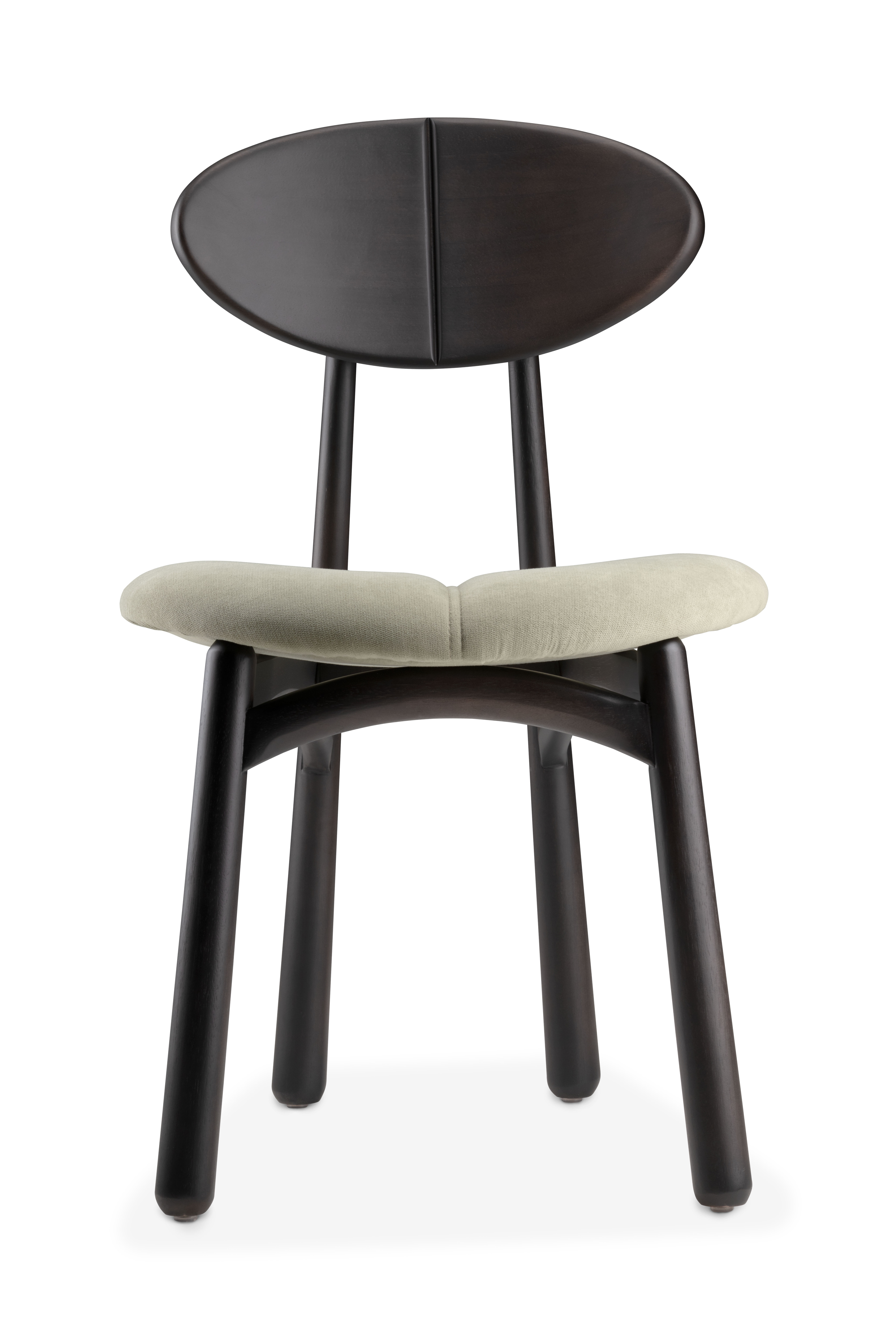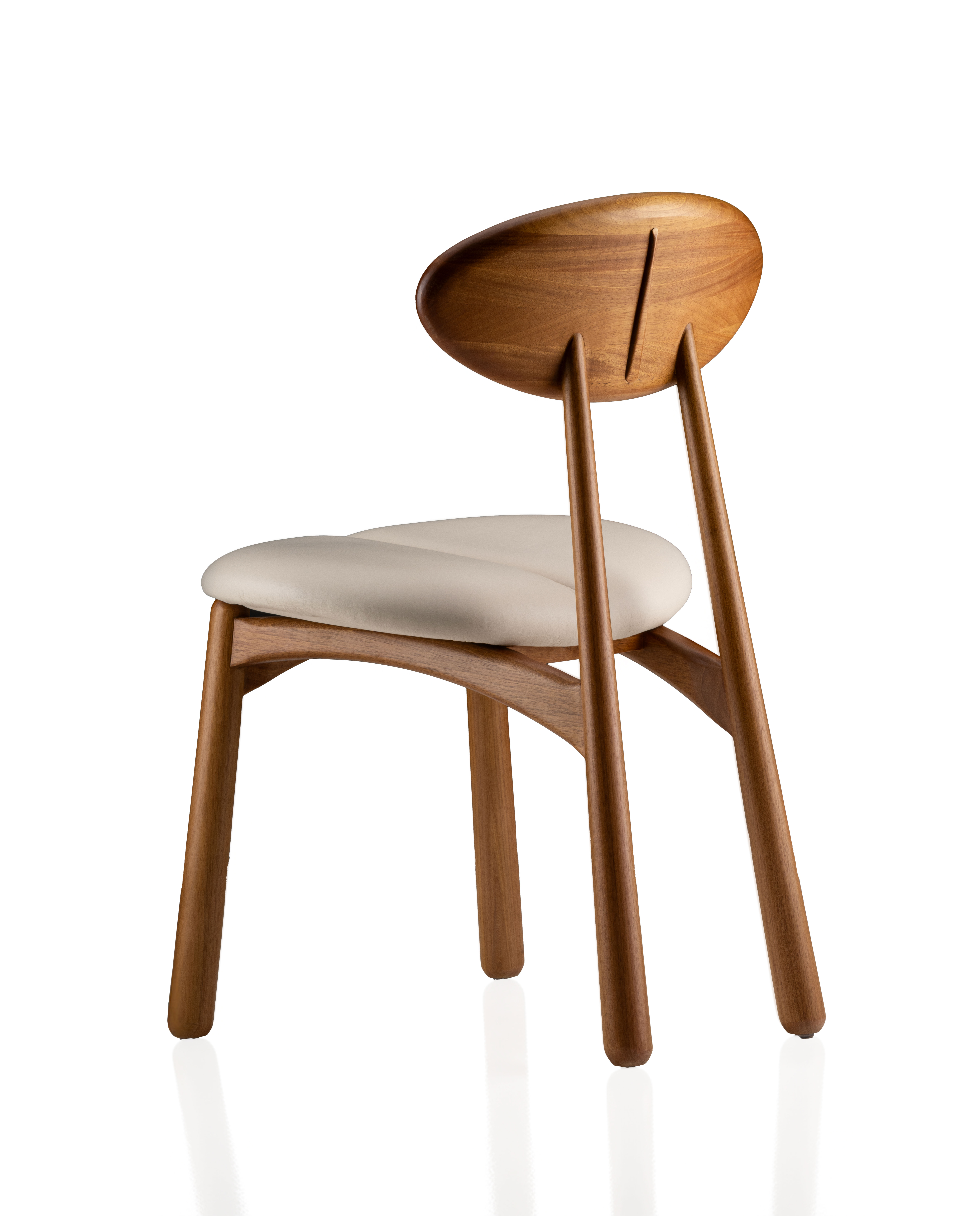 Inspirada nas formas arredondadas e sóbrias das folhas do pacová, o design do assento e do encosto da cadeira Pacová se molda ergonomicamente ao corpo, proporcionando conforto e suporte ideais. A nervura central do estofado e do encosto, referência à nervura adaxial da folha, cria um sutil afundamento que se estende por toda a cadeira, enquanto a nervura saliente do lado abaxial da folha é reproduzida nas costas do espaldar, como um tributo à complexidade e beleza da planta. Os pés, com sua forma que remete ao pecíolo do pacová, complementam o design, unindo funcionalidade e beleza.