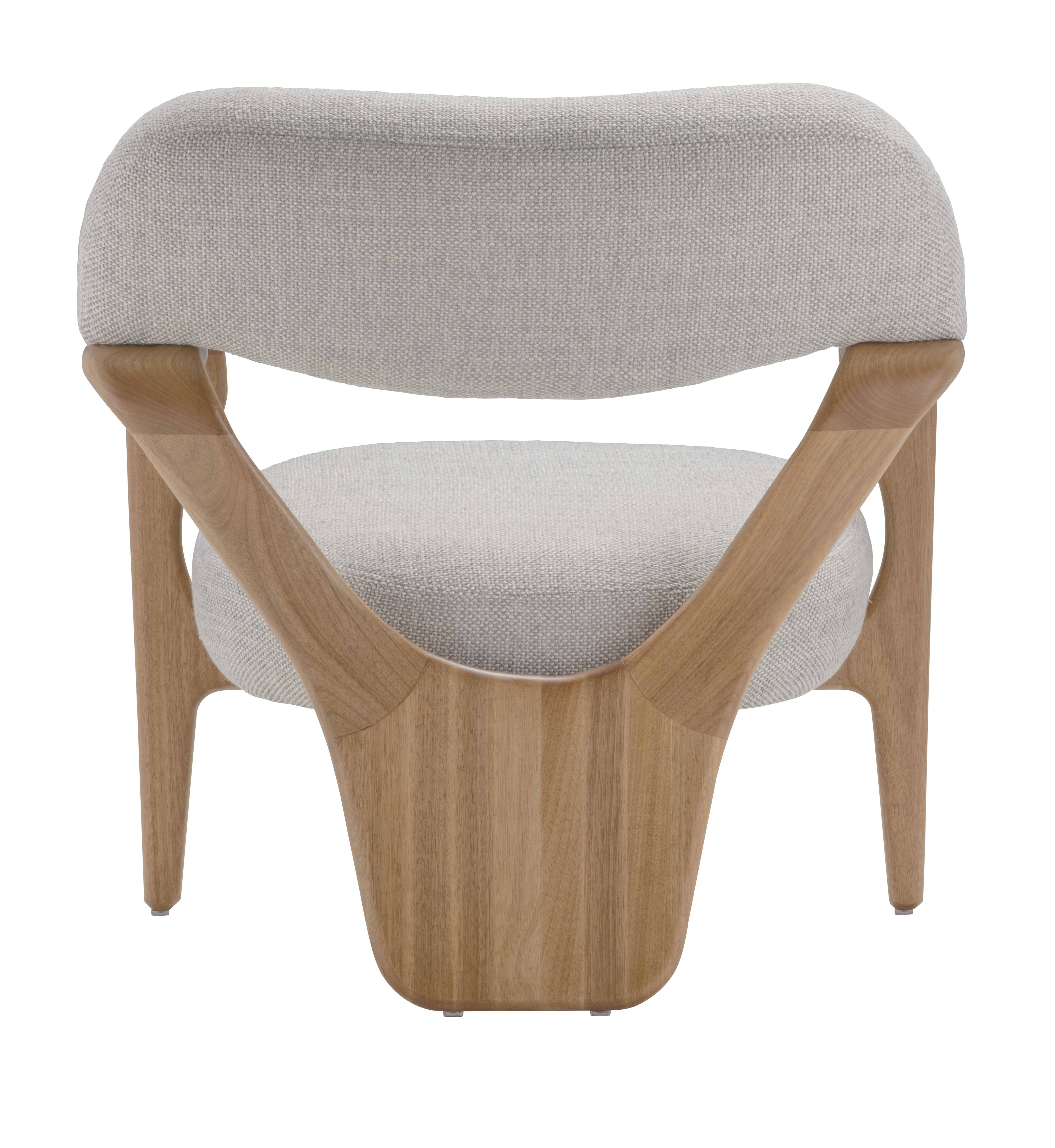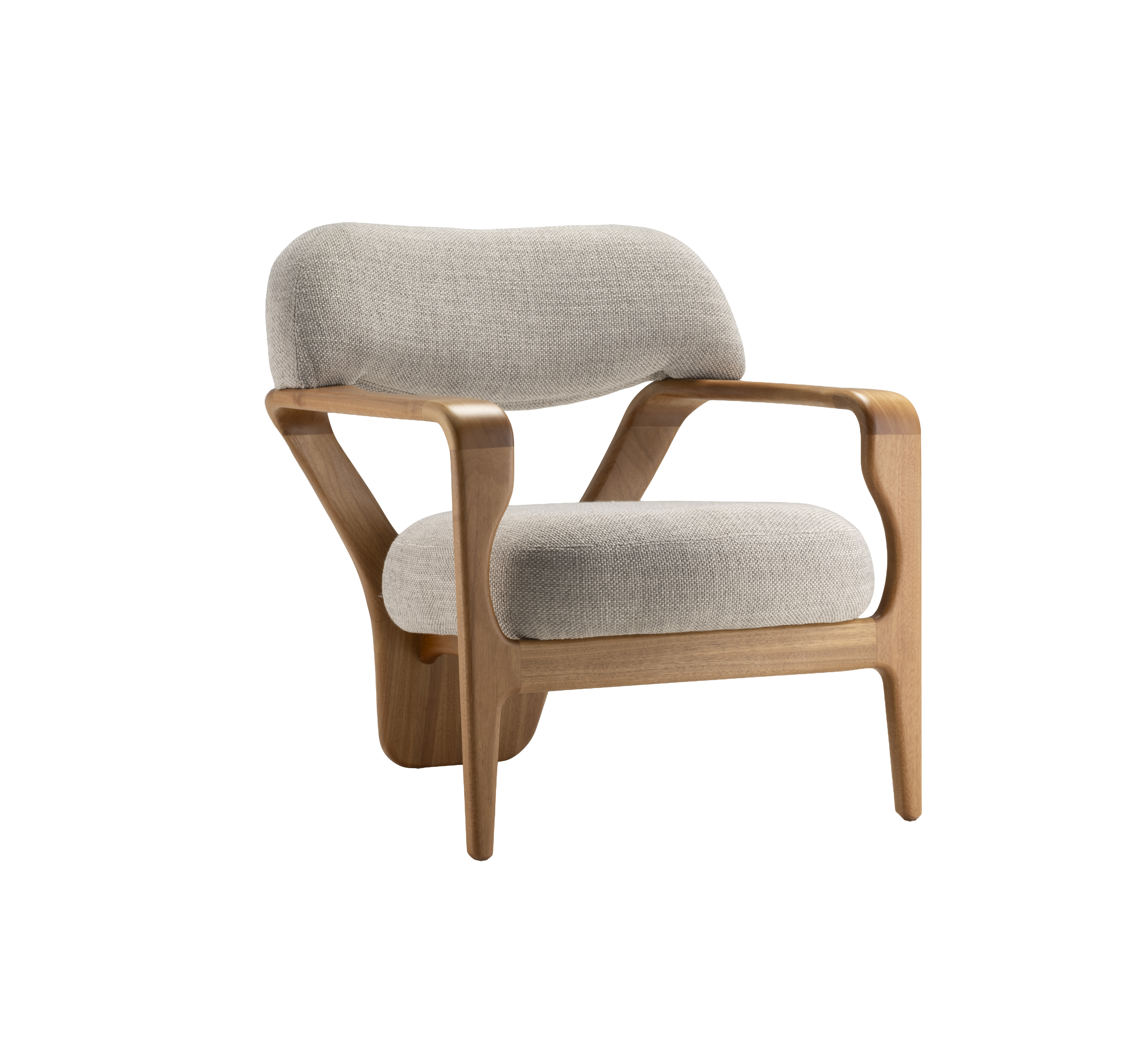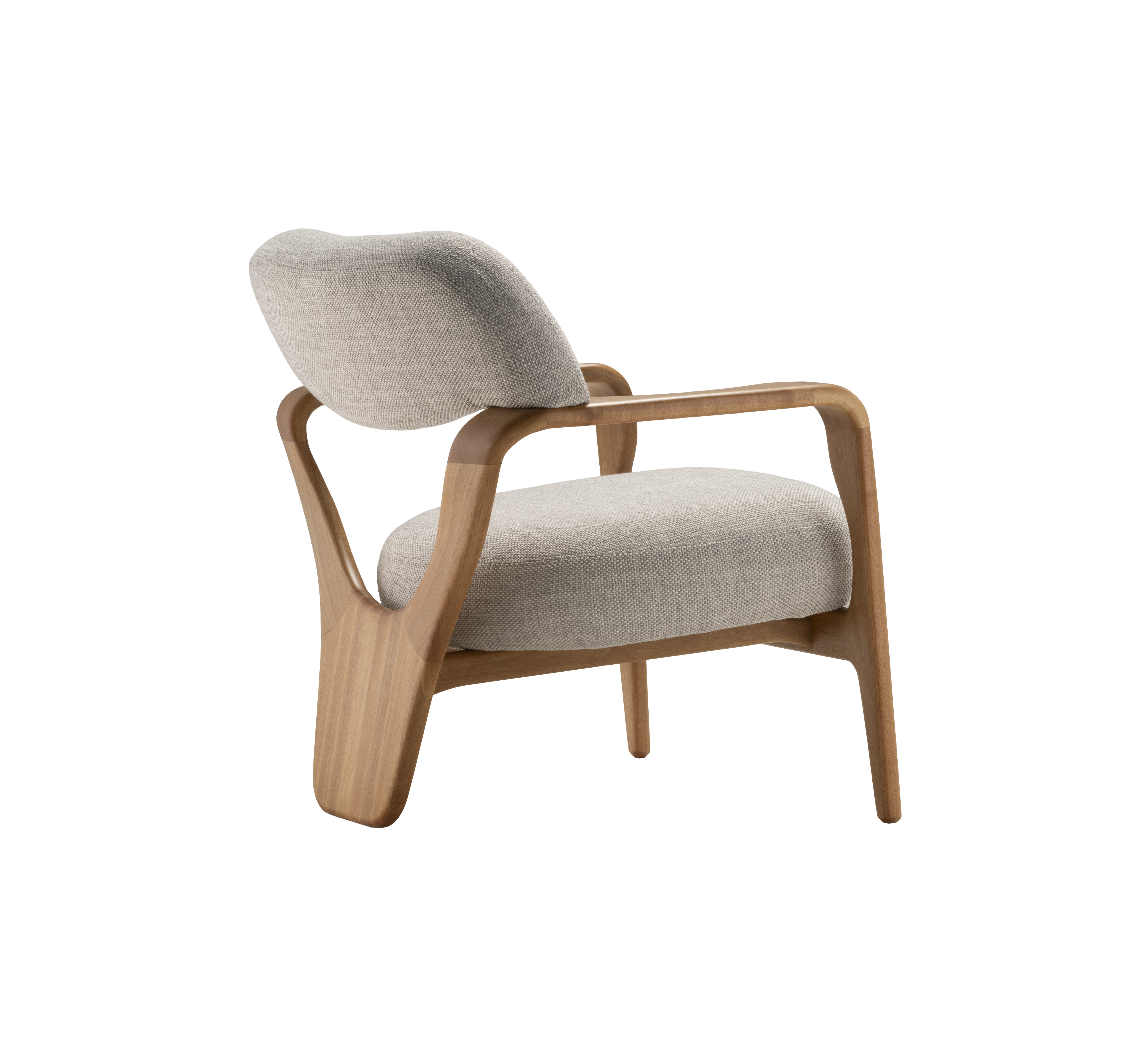 A poltrona Corpore é uma expressão do corpo em movimento, transformando a combinação de madeira e estofamento em um gesto orgânico e harmonioso. Suas formas contínuas abraçam o usuário com suavidade, convidando ao conforto e revelando uma estética inovadora e funcional. O pé traseiro, cuidadosamente esculpido, remete ao tronco humano e se abre como duas pernas em cambalhota, simbolizando leveza e equilíbrio. As superfícies vazadas na parte traseira e nas laterais trazem sutileza e permitem uma integração visual com o ambiente e com o usuário